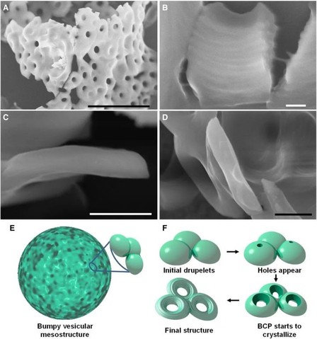 通过对多圆环结构形成过程的动力学研究,证明此自组装体的形成遵循独特的途径,并且PFS嵌段的结晶过程在此过程种起着决定性作用。图2为3D多圆环结构形成机理的示意图。首先,嵌段聚合物会自组装成微米级的囊泡结构,在没有晶种的条件下,得到无定形膜。但在PFS55-b-PI500晶种存在时,PFS-b-PS的自组装被限制在囊泡内,最终得到环形的结构。同时,在此混合溶剂中加入第三种溶剂,此介孔组装体的形态也会发生变化,可得到球形度更高的介孔结构,或者形成多环薄膜等。该溶液组装的过程证明了利用CDSA来制备新型复杂功能材料的巨大潜力,同时也为利用自下而上的组装方案来制备更多复杂结构的组装体提供了新方法。