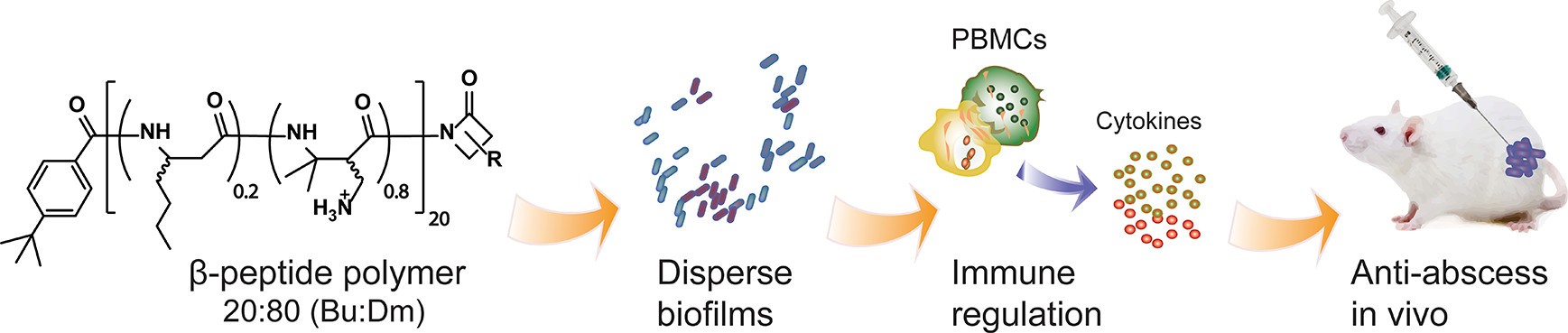 刘润辉教授课题组通过模拟宿主防御肽,前期发现了对多药耐药菌具有广谱高活性和微生物难以产生耐药性的抗菌多肽聚合物(Angew. Chem. Int. Ed. 2020, 59, 6412-6419; Angew. Chem. Int. Ed. 2020, 59, 7240-7244; ACS Infect. Dis. 2020, 6, 479-488; Biomater. Sci., 2019, 7, 2144-2151; Nat. Commun. 2018, 9, 5297.)。本研究中,针对临床上难以治愈的具有生物被膜和持续炎症挑战的溃疡等慢性感染,发现了具有高效抗生物被膜及免疫调节功能的β-多肽聚合物,在动物体内溃疡感染模型中展示出有效抗菌活性及促进溃疡愈合的功能。该成果以题为“Host Defense Peptide-Mimicking Amphiphilic β-peptide Polymer (Bu:DM) Exhibiting Anti-biofilm, Immunomodulatory and in vivo Anti-Infective Activity” 发表在药物化学领域国际权威期刊《药物化学杂志》(J. Med. Chem. 10.1021/acs.jmedchem.0c01321)。