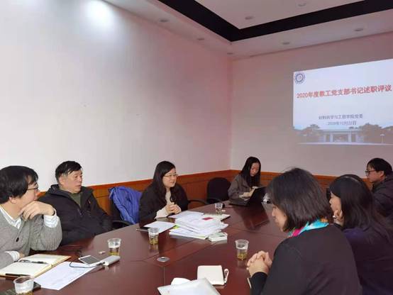 9名教工党支部书记认真总结回顾了2020年各党支部开展的主要工作,分享了各党支部的特色活动和经验做法。如高分子材料第二党支部将四史学习成果应用于研究生招生宣传,开展“历史的传承,创新的开拓”招生宣讲。支部多名党员坚持担任班导师和研究生兼职辅导员,保持全心全意为人民服务的党员本色;生物材料中心党支部借助融媒体技术开展支部生活,增强组织活动的吸引力,吸引优秀教师加入党组织,积极打造活力奋进型党支部;无机材料党支部注重与兄弟高校开展联合党建,相互交流,以党建引领课程思政建设;复合材料党支部将主题教育成果与实际业务工作相联系,发挥党员教师在科研成果转化上的引领作用,以党支部集体赴企业调研的形式,促成多项产学研合作,真正实现党建促发展。