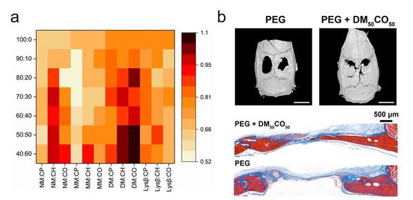刘润辉教授课题组通过结合RGD和KRSR两类细胞黏附多肽的结构特征,设计合成了一系列体内稳定性好、结构可调、容易制备的β-氨基酸聚合物,并利用前期本课题组构建的低背景噪音和高效功能分子筛选技术(J. Am. Chem. Soc. 2019, 141, 16772−16780)实现高通量筛选,发现了具有优异骨细胞黏附功能的聚合物,并在动物实验中展示了的优于商品化骨修复材料的效果。这一工作为设计新的细胞黏附功能材料提供了思路,发现的优选材料有望广泛应用于骨修复领域。