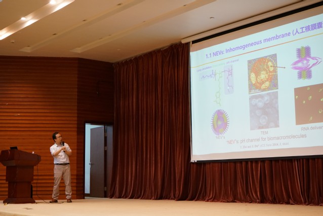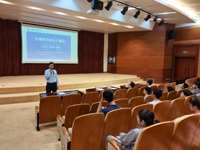 杜建忠教授通过事例与数据,为同学们介绍了高分子囊泡的生物结构与作用机理,为同学们在生物医用材料领域的探索提供了新思路。并用“非均相膜、非对称冠、膜冠融合”这12个字总结了对高分子囊泡的研究。杜建忠教授从脂质性囊泡开始讲起,指出了传统高分子囊泡仍存在的膜过于致密、内外冠对称、膜冠不融合这三个问题。在关于膜致密问题的讲述中,向同学们介绍了七种材料:人工核膜囊泡、双门控囊泡、以糖制糖囊泡、第二代以糖制糖囊泡、超声响应囊泡、护肾血管造影囊泡、骨靶向囊泡。用自己受动车启发而构建出“以糖制糖”机理的事情举例,倡导同学们要关注生活,从生活中寻求灵感。针对膜冠融合囊泡时,将“化敌为友”的哲学思想运用到囊泡中,即把细菌感染对骨性的不利因素转化为促进生长因子释放的有利因素,从而解决一些生物医学难题。他勉励同学们,很多医学问题的解决,都离不开材料的设计和化学的方法,未来生物等领域的发展需要新时代青年大学生的努力。
