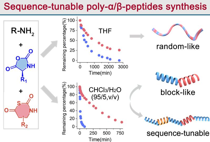 本研究着眼于解决多肽模拟物对酶降解可调和聚合物序列可控的关键性需求和挑战。通过α-NCA和β-NTA共聚实现了α/β-多肽的可控合成和对蛋白酶降解的调节;通过共聚反应中溶剂对单体聚合速率的调节作用,实现了α/β-多肽的序列可控合成。这一方法制备的α/β-多肽可通过改变氨基酸的序列和比例来调节蛋白酶稳定性和功能,作为一种降解可调节的多肽模拟物以适配不同应用场景。同时,这类α/β-多肽的合成方法在对蛋白质和多肽的折叠结构探索中具有潜在的重要意义。