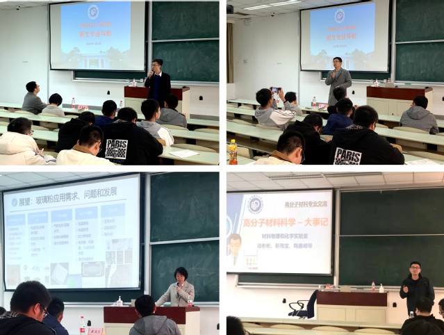 在高分子材料专业导航专场,徐彬彬以“智能高分子的设计与应用”为主题,为到场学生介绍了高分子材料的历史和发展。从最初的硫化橡胶性能到如今高分子学科的蓬勃发展,阐述了高分子学科对于推动人类文明发展的意义。此外,还介绍了所在课题组团队基本情况,包括成员组成、实验室条件以及最新科研成果。靳海宝和陶鑫峰从个人学业经历出发,讲述了本科生应该如何做好人生和未来职业发展的规划,希望同学们明确方向、规划未来,欢迎新生前往课题组实验室参观。