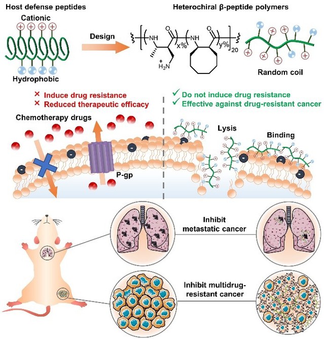 宿主防御肽具有广谱的抗菌功能,通过作用于细胞膜产生广谱抗菌活性,并且不易导致细菌耐药性。一小部分宿主防御肽也被发现具有一定的抗肿瘤功能。然而,由于天然宿主防御肽容易被酶解、合成困难、价格昂贵且难以大规模合成,其实际应用有限。本研究通过模拟宿主防御肽,合成了具有两亲性结构的β多肽聚合物,发现优选化合物对多种耐药肿瘤具有高效的体外和体内活性,在小鼠皮下耐药黑色素瘤,耐药乳腺肿瘤和黑色素瘤肺转移动物模型中均展示出接近甚至优于临床抗肿瘤药物的体内活性和良好的生物相容性。β多肽聚合物可抵制酶解,可通过“一锅法”大量合成。这一研究表明,模拟宿主防御肽的β多肽聚合物是设计和发现潜在抗耐药肿瘤分子的有效策略。