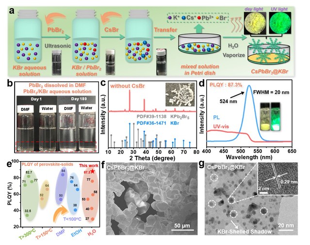 袁双龙课题组创新性提出一种非常简便的水蒸发结晶策略来制备CsPbBr3@KBr固体添加剂,其具有狭窄的半高峰宽、高量子产率以及优异的光照射和热稳定性。在高效发光实现实时显示的同时提高了TENG输出效率,将其与PVA结合作为TENG正极摩擦材料时,其输出性能提高了2.3倍,基于此构建了响应时间为125 ms和响应范围为0-100 kPa的可穿戴传感器用作人体实时运动监测,扩展了钙钛矿基材料的应用领域,并显示了其在自供电的可穿戴传感器领域的巨大前景。