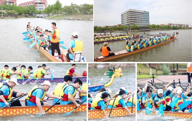 早上7点,部分校友相聚梅陇路130号,乘坐校车前往奉贤校区。8点半,队员们换好队服,在北岸码头集合,很多校友第一次划龙舟,带着“紧张而期待”的心情开启训练,在教练和领队的指导下,队员们迅速体会动作要领,队员们在欢声笑语中加深了对彼此的了解,也强化了团队协作。