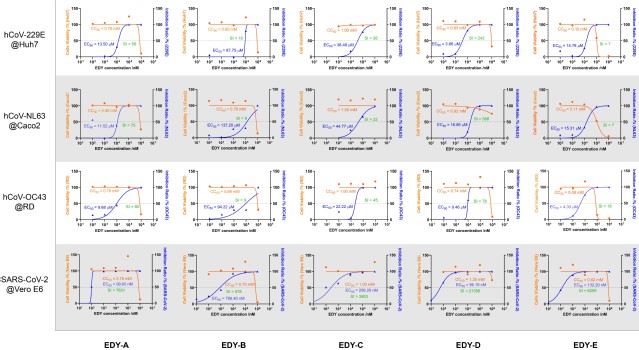 由于细胞表面的糖萼(多糖-蛋白质复合物)带有大量的负电荷,而冠状病毒的S蛋白,特别是受体结合域(receptor binding domain,RBD)具有高度正电荷集中的特点,因此冠状病毒可以通过静电相互作用结合到人类宿主细胞上。胡爱国教授研究组设计的复合烯二炔模拟了糖萼的电荷特性,在高反应活性的烯二炔分子上嫁接了多个硫酸盐基团。这些多阴离子基团的引入使得烯二炔不再进入细胞,从而不会对宿主细胞造成破坏。与此同时,烯二炔核心基团则在多阴离子基团的协助下与冠状病毒的S蛋白结合,通过其产生的高活性双自由基氧化破坏S蛋白的结构,从而使得冠状病毒失去与宿主细胞结合的能力。在敏感细胞系(Huh-7,hACE2/Caco2和RD)中通过空斑减数中和试验评估了这些复合烯二炔对人季节性冠状病毒(hCoV-229E, hCoV-NL63和hCoV-OC43)感染能力的影响。结果显示所有的烯二炔均对冠状病毒表现出明显的抑制作用。使用CCK-8细胞计数试剂盒检测烯二炔的细胞毒性,发现EDY-C即使在最高工作浓度(1 mM)下也没有表现出任何细胞毒性。本文作者进一步探究了这些烯二炔化合物对抗新冠病毒omicron变种的能力。研究结果发现,烯二炔作用浓度可以低至56 nM,而当其浓度超过mM级别时才表现出细胞毒性,选择性因子超过20000,说明其是一种潜在的安全高效的广谱抗新冠病毒药物。