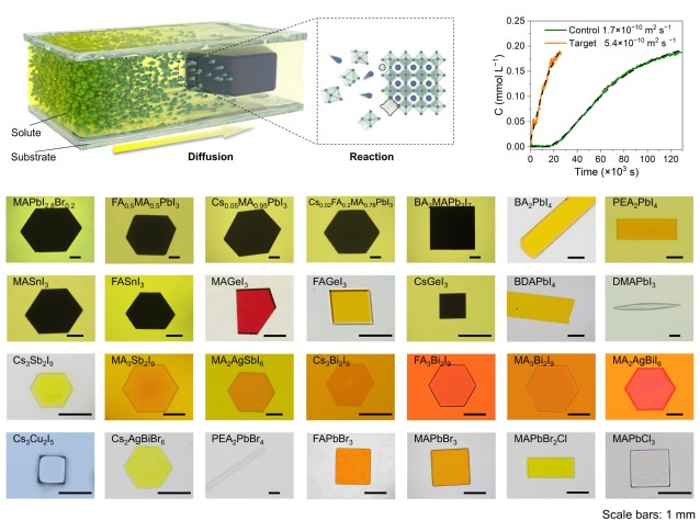 金属卤化物钙钛矿是一类光电性质优异、可溶液制备的新型半导体材料,在太阳能电池、发光二极管和辐射探测器等领域有重要应用。目前,这些器件主要采用多晶薄膜为光活性材料,其表界面悬挂键、不饱和键等缺陷将显著降低器件性能和使用寿命。单晶薄膜材料本体不含有晶界等缺陷,是制备光电子器件的理想候选材料,但如何可控、低温合成该类材料仍是该领域所面临的主要挑战。