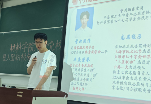 中级党校暨入团积极分子培训班于奉贤校区D202教室顺利开展。本次培训的主题是“红心向党建新功,青年报国正当时”,由王志鸿、于恒沣两位学生党员作为主讲人,结合自身部队服役、志愿活动经历分享成长体会和实践心得。