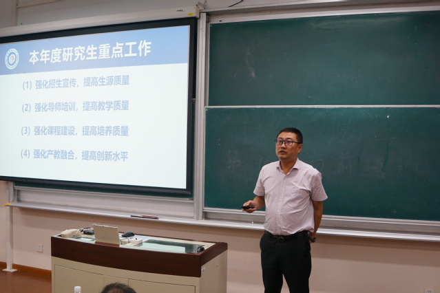 副院长胡彦杰从强化招生宣传、提升生源质量,强化导师培训、提高教学质量,强化课程建设、提高培养质量,强化产教融合、提高创新水平等方面汇报了研究生相关工作。