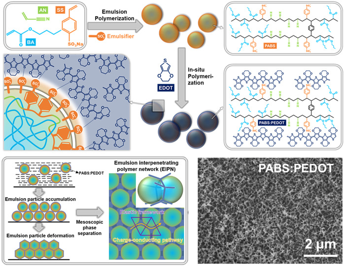 在这项工作中,通过分步乳液聚合,合成了一种由含磺酸盐的硬弹性共聚物核和聚(3,4-乙烯二氧噻吩)导电聚合物壳组成的水性导电粘结剂(PABS:PEDOT)。当该粘结剂干燥并触发乳胶颗粒融合时,基于内核组分和外壳组分间的静电作用以及各自链段的聚集特性,通过调控二次掺杂剂二甲基亚砜的引入,两者会发生介观相分离形成互穿网络。依靠源自内核的富含极性基团弹性骨架和源自外壳具有氧化还原介质功能的电荷传输通道的协同作用,赋予硫正极优异的倍率性能(4 C,817 mAh g-1)与循环稳定性(0.5 C,循环450次,容量保持率为81.6%)。由于各相的组成可以很容易地单独调整,该研究可以为电极粘结剂提供一种新的设计方法,以应对许多领域的多种性能要求。