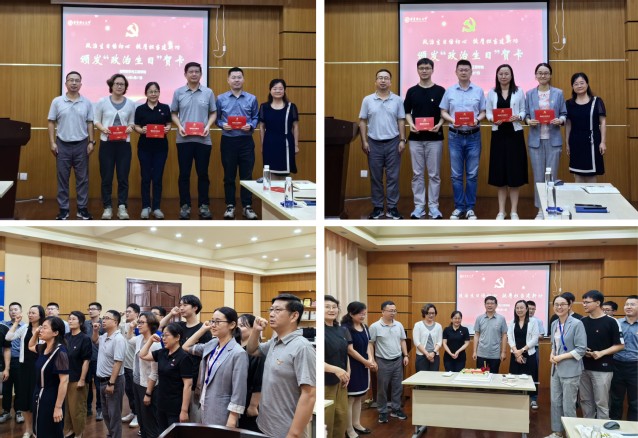 袁媛、杜建忠为党龄10年、15年、20年、25年、30年的教师颁发“政治生日”贺卡,并送上“政治生日”专属蛋糕和党组织的祝福和关怀。由袁媛领誓,全体党员面向党旗,一起重温入党誓词。铮铮誓言回荡在会场,传达出每一名党员对党和人民的坚定承诺。