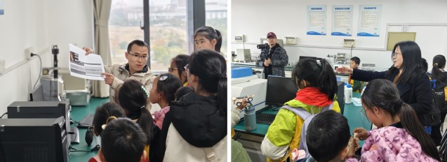杨晓华老师和陈健壮老师带领少先队员们参观实验中心,了解不同实验室的结构、各类测试仪器的功能等。提供探索科学奥秘的平台,激发他们对科学的兴趣和热爱。