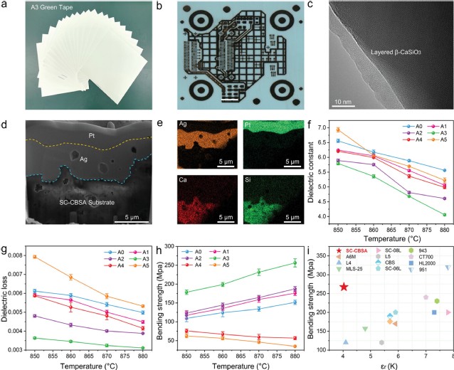 针对上述问题,研究团队突破传统技术瓶颈,将Al3+掺杂到钙硼硅酸盐(CBS)玻璃体系中来调节玻璃的短程有序(SRO)和中程有序(MRO)结构,促进了非均质网络结构的形成,使得在能量上有利于纳米级β-CaSiO3和亚纳米级α-CaSiO3多晶颗粒的析出。随着烧结温度的升高,α-CaSiO3中的[Si3O9]-环被逐渐打开,转变为以[SiO3]∞链为特征结构的β-CaSiO3晶体,相应的Si-O-Si键角从134.76°转变为143.31°,加快了纳米级α-CaSiO3(2-10 nm)被β-CaSiO3吸收的过程。最终,转变为有序层状结构的单晶体β-CaSiO3(1-2 µm),并且其在整个微晶玻璃中的占比可高达85%。该高单晶含量的微晶玻璃兼具低介电常数(4.04@15 GHz)和高抗弯强度(256 MPa),并首次将单晶结构应用于封装基板,并与银浆共烧匹配良好。这种新型基板的性能不仅达到国际先进水平,甚至在某些关键指标上表现更为出色。