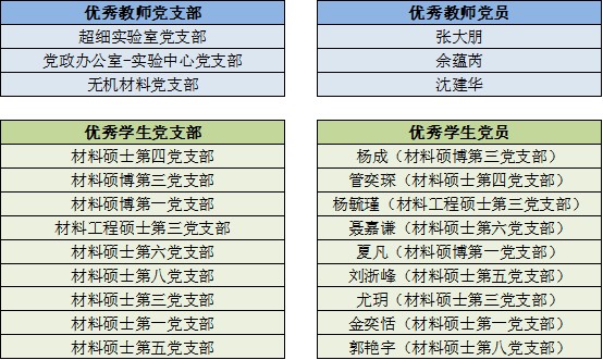 两场考评会由学院党委委员、教师代表、专职组织员、党建指导教师等担任评委。经无记名打分,超细实验室党支部等3个教师党支部、材料硕士第四党支部等9个学生党支部,张大朋等3位教师党员、杨成等9位学生党员获得年度优秀。