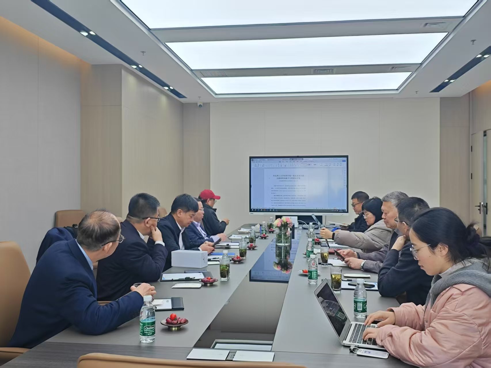 王锦山对各位副理事长的到来表示热烈欢迎,对扬州德沪钙钛矿产业园、德沪钙钛矿研究院进行了简要介绍。袁媛代表学院汇报了近期的校友工作以及先进材料大楼的搬迁情况。