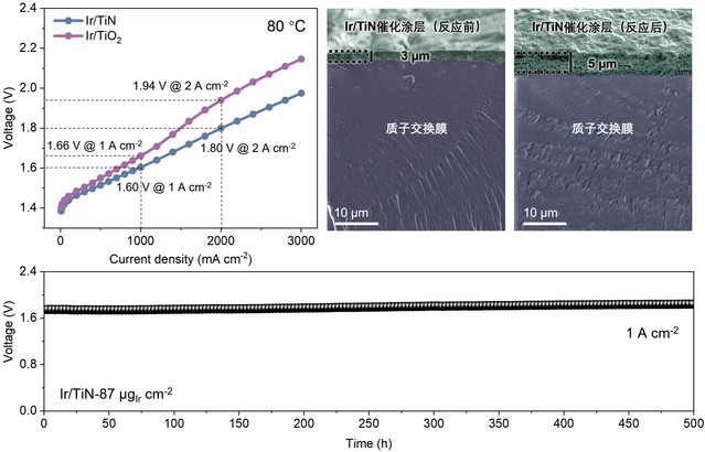 清洁能源材料与器件团队以Ir/TiN负载型催化剂为模型材料,追踪了其在长期OER运行过程中的结构演化趋势,发现了一种载体原位溶出诱导的物种捕获效应,实现载体失稳反向强化催化剂稳定性的作用机制。在长期测试过程中,TiN载体逐渐氧化溶出,同时部分Ti物种被催化剂表面捕获,趋于形成表面Ti锚定的无定形IrOx稳定结构,这种载体溶出诱导的捕获效应有效抑制了活性非晶IrOx的进一步溶出。通过该策略构建的负载型催化剂可以在反应过程中将Ir的溶出减少89%,从而使性能衰减速率降低83%。这种材料结构在工况环境下的自适应溶出,也在催化层中引发了一种独特的自增厚效应:催化层自发趋于疏松多孔并维持一定厚度,从而避免了超薄催化涂层结构完整性、机械稳定性以及平面电导率差的问题。基于上述结构特点,在87 μgIr cm-2 的超低负载量下,Ir/TiN作为阳极催化电极构建的PEM电解槽仅需1.60 V的槽压即可达到1.0 A cm-2的电流密度,并保持稳定运行500 h没有明显性能衰减。该研究加深了非氧化物材料作为OER催化剂载体的工况构效关系理解,并为可控构建超薄催化电极结构提供了一种全新思路,进而有助于大幅降低PEM电解水技术对贵金属的高度依赖性。