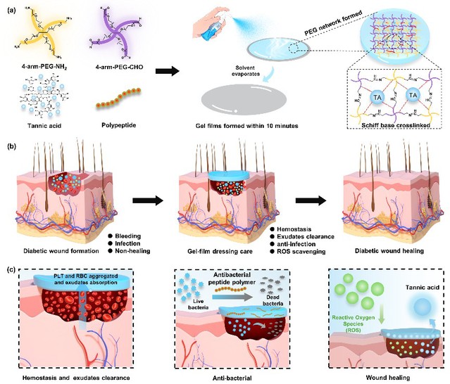 糖尿病创面常伴有微生物感染、活性氧(ROS)积累、出血和渗出液管理不善,导致其愈合困难。创面敷料具有治疗方案简单、可减轻患者疼痛和经济负担等优点被广泛用于临床治疗的研究,然而传统敷料不足以调节感染性糖尿病创面的复杂病理生理微环境,且临床使用过量抗生素会加剧细菌耐药性的发生,进一步增加治疗的难度。针对以上挑战,该研究通过使用广泛应用于组织工程领域的四臂聚乙二醇(4-arm-PEG)和单宁酸(TA)设计了一种可喷涂-蒸发制备的动态交联双网络结构水凝胶薄膜敷料,通过负载课题组前期开发的具有广谱高效抗菌活性和良好的生物安全性的β-氨基酸聚合物βLys50HG50,制备了具有高效抗菌活性、抗氧化、止血和渗出液清除能力的水凝胶薄膜敷料。在感染性糖尿病创面模型中,该敷料能有效清除创面中的活性氧积累和渗出液,并高效降低创面组织中的细菌负荷和提高创面愈合率,其治疗效果甚至优于临床治疗指南创面敷料Prontosan (B. Braun)。此外,该敷料在肝脏急性出血模型中实现15秒内快速止血,有效减少伤口出血量,优于临床使用的止血海绵Merocel (Medtronic),并在治疗完成后可按需室温下无痛移除。该研究为促进感染性糖尿病创面的愈合和临床管理提供了一种极具潜力的治疗选择。