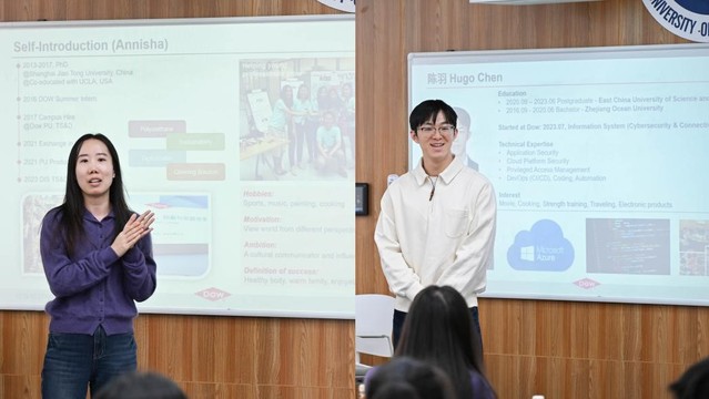 在经验分享环节,华理校友王楠与陈羽结合各自的学业与职业发展经历,分享了自己的工作心得与体会。王楠回顾了自己的学习历程,并讲述了在陶氏公司如何实现从学生到职场人的顺利转型。陈羽则分享了他在研究生期间自学计算机开发相关知识的经历,以及毕业后如何成功加入陶氏公司IT部门的求职历程。